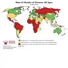 A map of the world showing murders per 100,000 population committed against women, 2019