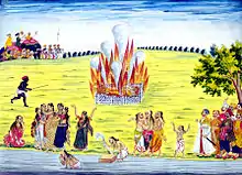 Sati (a Hindu practice whereby a widow immolates herself on the funeral pyre of her husband) ceremony.