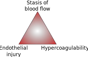 | Phenomena of interrupted blood-flow | Stasis [4] | The first category, alterations in normal blood flow, refers to several situations. These include venous stasis, long surgical operations, prolonged immobility (whilst on a long plane or car ride, bed bound during hospitalization), and varicose veins. The equivalence of Virchow's version and the modern version has been disputed.[5] |