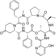 Virginiamycin is a streptogramin antibiotic similar to pristinamycin and quinupristin/dalfopristin. It is a combination of pristinamycin IIA (virginiamycin M1) and virginiamycin S1.[1] Virginiamycin is used in the fuel ethanol industry to prevent microbial contamination.[2] It is also used in agriculture, specifically in livestock, to accelerate the growth of the animals and to prevent and treat infections. [3] Antibiotics also save as much as 30% in feed costs among young swine, although the savings fade as pigs get older, according to a USDA study.[3]