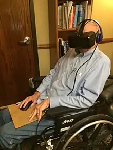 Virtual reality therapy (VRT), also known as virtual reality immersion therapy (VRIT), simulation for therapy (SFT), virtual reality exposure therapy (VRET), and computerized CBT (CCBT), is the use of virtual reality technology for psychological or occupational therapy and in affecting virtual rehabilitation. Patients receiving virtual reality therapy navigate through digitally created environments and complete specially designed tasks often tailored to treat a specific ailment; and is designed to isolate the user from their surrounding sensory inputs and give the illusion of immersion inside a computer-generated, interactive virtual environment. This technology has a demonstrated clinical benefit as an adjunctive analgesic during burn wound dressing and other painful medical procedures.[1][2][3] Technology can range from a simple PC and keyboard setup, to a modern virtual reality headset. It is widely used as an alternative form of exposure therapy, in which patients interact with harmless virtual representations of traumatic stimuli in order to reduce fear responses. It has proven to be especially effective at treating PTSD, and shows considerable promise in treating a variety of neurological and physical conditions. Virtual reality therapy has also been used to help stroke patients regain muscle control, to treat other disorders such as body dysmorphia, and to improve social skills in those diagnosed with autism.[4]
