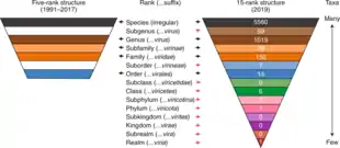 Viral classification starts at the level of realm and continues as follows, with the taxonomic suffixes in parentheses:[7]