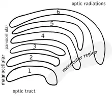 The lateral geniculate nucleus (LGN) is a sensory relay nucleus in the thalamus of the brain. The LGN consists of six layers in humans and other primates starting from catarhinians, including cercopithecidae and apes. Layers 1, 4, and 6 correspond to information from the contralateral (crossed) fibers of the nasal retina (temporal visual field); layers 2, 3, and 5 correspond to information from the ipsilateral (uncrossed) fibers of the temporal retina (nasal visual field). Layer one (1) contains M cells which correspond to the M (magnocellular) cells of the optic nerve of the opposite eye and are concerned with depth or motion. Layers four and six (4 & 6) of the LGN also connect to the opposite eye, but to the P cells (color and edges) of the optic nerve. By contrast, layers two, three and five (2, 3, & 5) of the LGN connect to the M cells and P (parvocellular) cells of the optic nerve for the same side of the brain as its respective LGN. Spread out, the six layers of the LGN are the area of a credit card and about three times its thickness. The LGN is rolled up into two ellipsoids about the size and shape of two small birds' eggs. In between the six layers are smaller cells that receive information from the K cells (color) in the retina. The neurons of the LGN then relay the visual image to the primary visual cortex (V1) which is located at the back of the brain (posterior end) in the occipital lobe in and close to the calcarine sulcus. The LGN is not just a simple relay station but it is also a center for processing; it receives reciprocal input from the cortical and subcortical layers and reciprocal innervation from the visual cortex.[25]
