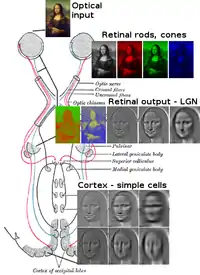 ![]() The visual system includes the eyes, the connecting pathways through to the visual cortex and other parts of the brain (human system shown). | |