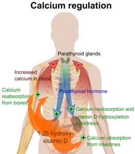 VDR activation in the intestine, bone, kidney, and parathyroid gland cells leads to the maintenance of calcium and phosphorus levels in the blood (with the assistance of parathyroid hormone and calcitonin) and to the maintenance of bone content.[20]