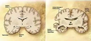 "Dementia" is a term referring to neurodegenerative disorders characterized by a loss of memory and such brain functions executive functioning. Included under this umbrella term is Alzheimer's disease. Alzheimer's disease is characterized by the loss of cortical functions like language and motor skills.[7] Patients with Alzheimer's disease exhibit an extreme shrinkage of the cerebral cortex and hippocampus with an enlargement of the ventricles. In several recent studies, higher vitamin D levels have been associated with lower risks of developing Alzheimer's disease.[11] Alzheimer's disease is associated with a decrease in vitamin D receptors in the Cornu Ammonius areas (CA 1& 2) of the hippocampus.[7] The hippocampus is a portion of the limbic system responsible for memory and spatial navigation. Additionally, certain VDR haplotypes were detected with increased frequency in patients with Alzheimer's disease while other VDR haplotypes were detected with decreased frequency, suggesting that specific haplotypes may increase or decrease risk of developing Alzheimer's.[12][13] It is hypothesized that this lack of VDRs in the hippocampus prevents the proper functioning (ie. memory) of this structure.