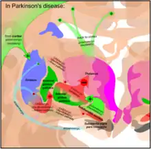Parkinson's disease is characterized by progressive deterioration of movement and coordination. Patients with Parkinson's disease lose dopaminergic (DA) neurons in the substantia nigra.,[14] a part of the brain that plays a central role in such brain functions as reward, addiction, and coordination of movement. Studies suggest that low vitamin D levels could play a role in PD, and in one case report, vitamin D supplements lessened parkinsonian symptoms. In a study of vitamin D receptor knockout mice, mice without VDR exhibited motor impairments similar to impairments seen in patients with Parkinson's disease.[7] One proposed mechanism linking vitamin D to Parkinson's disease involves the Nurr 1 gene. Vitamin D deficiency is associated with decreased expression of the Nurr1 gene, a gene responsible for development of DA neurons. It is therefore plausible that a lack of Nurr1 expression leads to impaired DA neuronal development. Failure to form DA neurons would lead to lower dopamine concentrations in the basal ganglia. Additionally, rats lacking Nurr1 exhibited hypoactivity followed by death shortly after birth.[14]