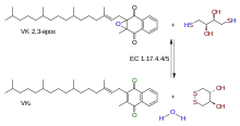 Vitamin K epoxide reductase (VKOR) is an enzyme (EC 1.17.4.4) that reduces vitamin K after it has been oxidised in the carboxylation of glutamic acid residues in blood coagulation enzymes. VKOR is a member of a large family of predicted enzymes that are present in vertebrates, Drosophila, plants, bacteria and archaea.[1] In some plant and bacterial homologues, the VKOR domain is fused with domains of the thioredoxin family of oxidoreductases.[1]