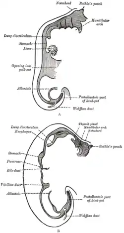 Sketches in profile of two stages in the development of the human digestive tube. (Vitelline duct labeled on bottom image.)