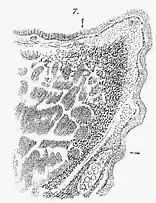 Sub-epithelial cysts (also known as mucous retention cysts) are closed lesions that occur from a build-up of tissue on the vocal folds.[2] They are typically found in the middle portion of the upper lamina propria of the vocal folds.[2] Sub-epithelial cysts are small and white in colour.[7] Their presence on the vocal folds usually does not disrupt the vibration of the vocal folds for speech (known as the "mucosal wave").[2]
