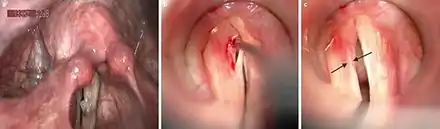 Vocal fold cysts (also known as vocal cord cysts) are benign masses of the membranous vocal folds.[1] These cysts are enclosed, sac-like structures that are typically of a yellow or white colour.[2] They occur unilaterally on the midpoint of the medial edge of the vocal folds.[1] They can also form on the upper/superior, surface of the vocal folds.[1] There are two types of vocal fold cysts:[1]