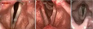 There are generally four components included in the full diagnosis of a vocal cord cyst: a medical and voice history, a head and neck exam, a perceptual assessment of the voice and imaging of the vocal folds.[11] A medical and voice history can help distinguish patterns of misuse and phonotrauma to assist in diagnosis.[3] The primary perceptual sign of vocal fold cysts is hoarseness of the voice.[3] Diagnosis through perceptual means alone is difficult, therefore in the fourth component of diagnosis the patient often undergoes an imaging procedure.[2][12] Imaging is most commonly done with laryngeal videostroboscopy.[11] A videostrobosopy is an examination of the vocal folds using flashes of light to slow down the image of the vocal fold movement enough to provide a sharp picture of the phases of the movement cycle (mucosal wave.)[13] This procedure provides information about vocal fold vibrations during speech, vocal intensity and vocal frequency.[11] Imaging shows the reduced movement of the vocal folds (mucosal wave) when a vocal fold cyst is present.[11] Further, videostroboscopy tends to show increased submucosal swelling in the affected areas of the vocal fold(s)[9] More recently, other technologies have been introduced to assist with obtaining imaging of the vocal folds, including the use of Narrow-band imaging (NBI.)[12] Narrow-band imaging involves the use of blue and yellow lights to improve the picture quality of an image and accentuate blood vessel visibility.[12] NBI has been found to help improve visual identification of vocal fold cysts in some cases.[12]