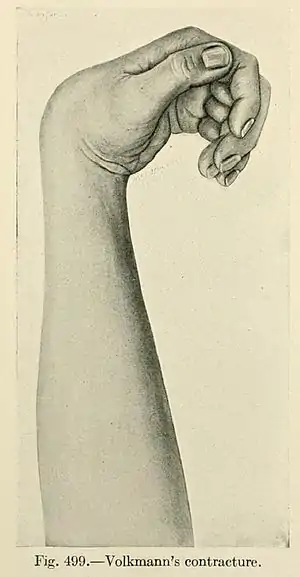 It is named after Richard von Volkmann (1830–1889), the 19th century German doctor who first described it,[2] in a paper on "non-Infective Ischemic conditions of various fascial compartments in the extremities".[3] Because the contracture occurred at the same time as the paralysis, he considered a nerve cause to be unlikely.[4]