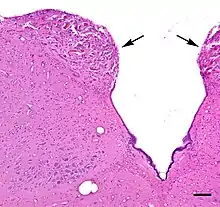 Micrograph of the area postrema (arrows) in a transverse section through the lower brainstem of a squirrel monkey (Saimiri sciureus). Hematoxylin and eosin stain; Bar=100 microns (0.1 millimeter).