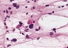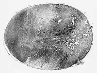 ![]() Glioblastoma arising in an astrocytoma. This spinal cord exhibits both a lightly staining microcystic astrocytoma as well as a darkly staining glioblastoma. | |