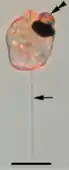 | A light micrograph of an ocelloid-containing dinoflagellate from the genus Proterythropsis. The nucleus is marked n, the ocelloid is indicated with a double arrowhead, and a posterior cell extension is indicated with an arrow; scale bar = 10 µm.[1] | |