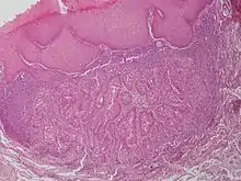 Warty dyskeratoma, also known as an Isolated dyskeratosis follicularis,[1]:777 is a benign[2] epidermal proliferation with distinctive histologic findings that may mimic invasive squamous cell carcinoma[3] and commonly manifests as an umbilicated (Having a central mark or depression resembling a navel) lesion with a keratotic plug,[4] WD have some histopathologic similarities to viral warts but it's not caused by HPV and the majority of these lesions display overall histopathologic features consistent with a follicular adnexal neoplasm.[5] Usually limited to the head, neck,[6] scalp[7] or face and vulva.[6] Lesions are generally solitary and sporadic and may be associated with a follicular unit. Oral involvement,[4] particularly the hard palate, and genital involvement have been reported. it can also be thought of as one of the manifestations of focal acantholytic dyskeratosis, an epidermal reaction pattern that can be seen in several disorders, including Darier's disease and Grover's disease.[8]:639 But the main Difference between Darier disease and Warty dyskeratoma, is that Darier disease inherited dermatosis (autosomal dominant) consisting of multiple keratotic papules on the face, trunk, and extremities, while WD occurs as an isolated, noninherited, single keratotic nodule mainly confined to the head and neck as mentioned earlier.[6]
