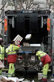 A waste collector, also known as a garbageman, trashman (in the US), dustman or binman (in the UK), is a person employed by a public or private enterprise to collect and dispose of municipal solid waste (refuse) and recyclables from residential, commercial, industrial or other collection sites for further processing and waste disposal. The first known waste collectors were said to come from Britain in the 1350s, coinciding with the Black Plague and were called "rakers."[1] Specialized waste collection vehicles (also known as garbage trucks in the US, dustbin lorries in the UK) featuring an array of automated functions are often deployed to assist waste collectors in reducing collection and transport time and for protection from exposure. Waste and recycling pickup work is physically demanding and usually exposes workers to an occupational hazard.