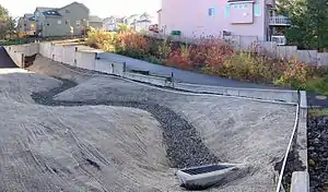 Sedimentation basins (otherwise known as sediment basins) are used to remove (by settling) coarse to medium-sized sediments and to regulate water flows and are often the first element in a WSUD treatment system.[7] They operate through temporary stormwater retention and reduction of flow velocities to promote settling of sediments out of the water column. They are important as a pretreatment to ensure downstream elements are not overloaded or smothered with coarse sediments. Sedimentation basins can take various forms and can be used as permanent systems integrated into an urban design or temporary measures to control sediment discharge during construction activities. They are often designed as an inlet pond to a bioretention basin or constructed wetland. Sedimentation basins are generally most effective at removing coarser sediments (125 μm and larger) and are typically designed to remove 70 to 90% of such sediments.[1] They can be designed to drain during periods without rainfall and then fill during runoff events or to have a permanent pool. In flow events greater than their designed discharge, a secondary spillway directs water to a bypass channel or conveyance system, preventing the resuspension of sediments previously trapped in the basin.
