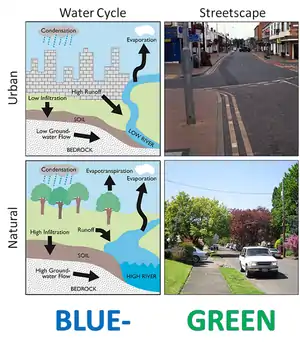Water-sensitive urban design (WSUD) is a land planning and engineering design approach which integrates the urban water cycle, including stormwater, groundwater and wastewater management and water supply, into urban design to minimise environmental degradation and improve aesthetic and recreational appeal.[1] WSUD is a term used in the Middle East and Australia and is similar to low-impact development (LID), a term used in the United States; and Sustainable Drainage System (SuDS), a term used in the United Kingdom.
