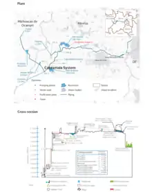 It utilizes 7 reservoirs, a 127-km long aqueduct with 21 km of tunnels, 7.5 km open canal, and a water treatment plant. Its cost was US$1.3 billion.[4] While providing Mexico City with over 20% of its water, the Cutzamala system currently operates at only 47% of its total capacity.[5] Both systems are operated by the National Water Commission.