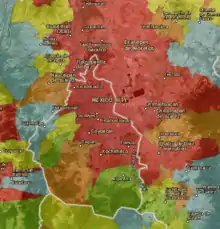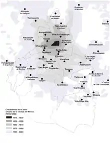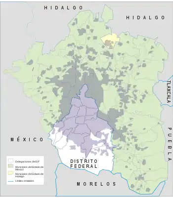 To prevent urbanization, a total of 182 Federally Protected Natural Areas (NPA) have been declared throughout the country and cover 90,893,522 hectares.[23] Additionally, state protected areas exists: Mexico City has a total of 23 NPAs, covering a total of 26,047 hectares.[24] The State of Mexico has a total of 88 NPAs, covering a total of 983,984 hectares.[25] Despite of this, the Mexico City Metropolitan Area (MCMA) has grown physically and demographically since 1930's. It spreads over a surface of 4,250 km2 and has a metropolitan population of approximately 21.2 million, concentrating 18% of the country's population.[20] It covers over 16 boroughs of Mexico City and 34 municipalities of State of Mexico.