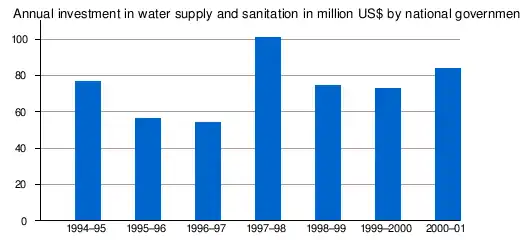 | Annual investment in WSS | US$0.55/capita (Average 1993/95–2000/01)[8][9] |