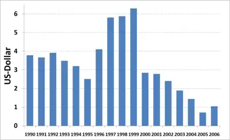 According to the Controlaría General de la República, US$ 203 million were invested in water supply and sanitation from 1990 to 2006, which is on average US$ 3.3 per capita and year. The investment reached its peak in 1999, when it was US$ 6.3 per capita. Since 2000, it fell back substantially until reaching only US$ 0.7 in 2005 and US$ 1.1 in 2006. Compared to other Latin American countries, this investment level is very low.[12]