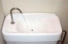 Water saving device on a Japanese toilet: The tank with the water for flushing is refilled through a tap at the top of the tank so that users can wash their hands and recycle the water for flushing