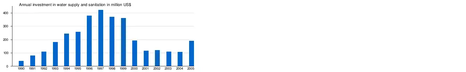Between 1990 and 1998, an annual average of US$228.9 million was invested for water and sanitation infrastructure, equivalent to 0.5% of the GDP. In this period the investments in the sector increased from US$1.1/per capita in 1990 to US$15/per capita in 1998, the latter being an unusually high investment level compared to other Latin American countries.[13][29] These investments were financed as follows: