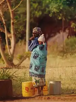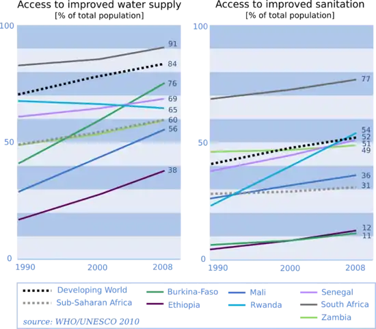 In 2015, 61% of the total population had access to an "at least basic water service", or 86% of the urban population and 44% of the rural population.[7] However, around 6 million people in Zambia still lack access to "at least basic water". As for sanitation, in 2015, 31% of the total population had access to "at least basic sanitation" service. 49% of the urban population had access to basic sanitation and 19% of the rural population. There are still around 11 million people who lack access to at least basic sanitation. Moreover, in 2015, 15% of the population in Zambia, defecated in the open.[8][9]