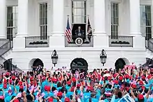 Many of the infections appeared to be related to a ceremony held on September 26 in the Rose Garden for the nomination of Amy Coney Barrett to the Supreme Court, where seating was not socially distanced and participants were mostly unmasked. Trump himself may have been infectious at that point, but he and his entourage attended several subsequent events unmasked, including the first presidential debate against Joe Biden in Cleveland, Ohio on September 29.[8] The next day, Presidential Counselor Hope Hicks was placed in quarantine aboard Air Force One while returning with Trump from a campaign event in Minnesota. Following that, the president proceeded on schedule to an October 1 New Jersey fundraiser where he mingled, unmasked, with donors.[9] More infections were reported in late October among Vice President Mike Pence's staff,[10] and a second large outbreak occurred after Election Day, after Trump held a watch party in the East Room.[11]