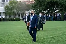 At 12:54 a.m. EDT on October 2, Trump announced via Twitter that both he and the first lady had tested positive for the SARS-CoV-2 virus that night.[151][152] The afternoon of the same day, the White House announced that Trump would be hospitalized at Walter Reed National Military Medical Center in Bethesda, Maryland "for the next few days" "out of an abundance of caution", on the recommendation of the medical team headed by Sean Conley, a Doctor of Osteopathic Medicine who had been the Physician to the President since 2018. Because he was a Navy commander, Conley was obliged to follow the orders of his commander-in-chief.[153] Trump, who was wearing a mask, was briefly filmed walking unassisted from the White House to the Marine One helicopter outside to transport him to Walter Reed.[136] According to White House Chief of Staff Mark Meadows, Trump was hospitalized because he "had a fever and his blood oxygen level had dropped rapidly".[154] The Associated Press reported that "a person familiar with Trump's condition confirmed that Trump was given oxygen at the White House" in the morning before arriving at Walter Reed, although Trump's doctors refused to say whether he had ever been given supplemental oxygen.[155]