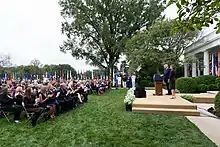 On September 26, 2020, an event was held in the White House Rose Garden announcing Amy Coney Barrett's nomination to the Supreme Court following the death of Ruth Bader Ginsburg.[54] More than 150 people attended; they were told they did not need to wear masks if they had tested negative that day. Chairs for the outdoor ceremony were placed side by side, and there were two crowded indoor receptions.[49][55] At least seven attendees tested positive for SARS-CoV-2 in the following week, including[56] President Trump, First Lady Melania Trump, Senators Mike Lee and Thom Tillis, University of Notre Dame president John I. Jenkins, former Counselor to the President Kellyanne Conway, and former New Jersey Governor Chris Christie.[57][58] Barrett had suffered infection in the summer before recovering and testing negative.[59][60] Michael D. Shear, a White House correspondent for The New York Times, first tested positive for the virus October 2, as did many others. He was not present at the Rose Garden event, but had visited the White House on September 27 for a COVID-19 test, required before traveling with the President to a rally in Pennsylvania.[61]