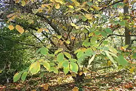 The name witch in witch-hazel has its origins in Middle English wiche, from the Old English wice, meaning "pliant" or "bendable", and is not related to the word witch meaning a practitioner of magic.[5] Jacob George Strutt's 1822 book, Sylva Britannica attests that "Wych Hazel" was used in England as a synonym for wych elm, Ulmus glabra;[6] The use of the twigs as divining rods, just as hazel twigs were used in England, may also have, by folk etymology, influenced the "witch" part of the name.[3]