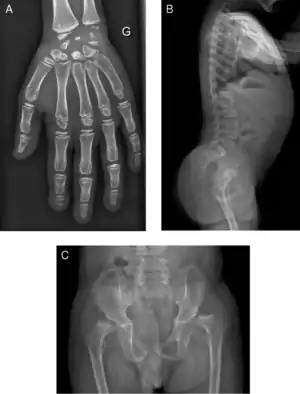 | Radiograph of a WRS child presenting with dysplastic bone growth in various regions of the body. | |