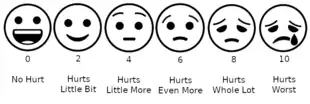 The Wong–Baker Faces Pain Rating Scale is a pain scale that was developed by Donna Wong and Connie Baker. The scale shows a series of faces ranging from a happy face at 0, or "no hurt", to a crying face at 10, which represents "hurts like the worst pain imaginable". Based on the faces and written descriptions, the patient chooses the face that best describes their level of pain.[1]