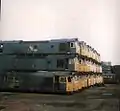 Former Pacific Electric Railway streetcars stacked at a junkyard awaiting destruction in the US, March 1956
