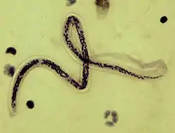 | Microfilar of W. bancrofti, from a patient seen in Haiti - the thick blood smears are stained with hematoxylin | |
