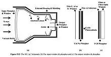 The overall function of an image intensifier is to convert incident x-ray photons to light photons of sufficient intensity to provide a viewable image. This occurs in several stages. The first is conversion of X-ray photons to light photons by the input phosphor. Sodium activated Cesium Iodide is typically used due to its high conversion efficiency thanks to high atomic number and mass attenuation coefficient.[2] The light photons are then converted to electrons by a photocathode. A potential difference (25-35 kilovolts) created between the anode and photocathode then accelerates these photoelectrons while electron lenses focus the beam down to the size of the output window. The output window is typically made of silver-activated zinc-cadmium sulfide and converts incident electrons back to visible light photons.[2] At the input and output phosphors the number of photons is multiplied by several thousands, so that overall there is a large brightness gain. This gain makes image intensifiers highly sensitive to X-rays such that relatively low doses can be used for fluoroscopic procedures.[3][4][5][6]