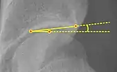 On CT, the anterior center-edge Lequesne’s angle can be measured in a false profile view of the hip or in a sagittal CT scan. In this case the tangent line touches the anterior rim of the acetabulum. Values under 20° indicate undercoverage of the femoral head.[3]