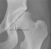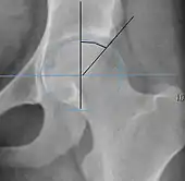 Superior to the Tönnis angle in cases without joint space narrowing or subluxation.[12] The medial point of the sourcil is defined as being at the same height as the most superior point of caput femoris. | −6 to 12°[12]