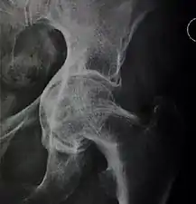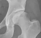 X-rays of hip dysplasia are one of the two main methods of medical imaging to diagnose hip dysplasia, the other one being medical ultrasonography.[1][2] Ultrasound imaging yields better results defining the anatomy until the cartilage is ossified. When the infant is around 3 months old a clear roentgenographic image can be achieved. Unfortunately the time the joint gives a good x-ray image is also the point at which nonsurgical treatment methods cease to give good results.