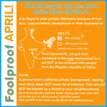The COVID-19 pandemic, which was first reported in the city of Wuhan, Hubei, China, in December 2019, has led to an increase in acts and displays of Sinophobia as well as prejudice, xenophobia, discrimination, violence, and racism against people of East Asian, North Asian and Southeast Asian descent and appearance around the world. With the spread of the pandemic and formation of hotspots, such as those in Asia, Europe, and the Americas, discrimination against people from these hotspots has been reported.[1][2][3]