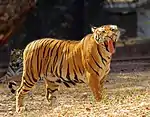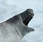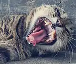 In animals, yawning can serve as a warning signal. For example, Charles Darwin, in his book The Expression of the Emotions in Man and Animals, mentioned that baboons yawn to threaten their enemies, possibly by displaying large canine teeth.[50] Similarly, Siamese fighting fish yawn only when they see a conspecific (same species) or their own mirror-image, and their yawn often accompanies aggressive attack.[51] Guinea pigs also yawn in a display of dominance or anger, displaying their impressive incisor teeth. This is often accompanied by teeth chattering, purring and scent marking. Adelie penguins employ yawning as part of their courtship ritual. Penguin couples face off and the males engage in what is described as an "ecstatic display", opening their beaks and pointing their faces skyward. This trait has also been seen among emperor penguins. Researchers have been attempting to discover why these two different species share this trait, despite not sharing a habitat. Snakes yawn, both to realign their jaws after a meal and for respiratory reasons, as their trachea can be seen to expand when they do this. Dogs, and occasionally cats, often yawn after seeing people yawn[4][52] and when they feel uncertain.[53] Dogs demonstrate contagious yawning when exposed to human yawning. Dogs are very adept at reading human communication actions, so it is unclear if this phenomenon is rooted in evolutionary history or a result of domestication.[54] Fish can also yawn, and they will increase this behavior when experiencing a lack of oxygen.[55]