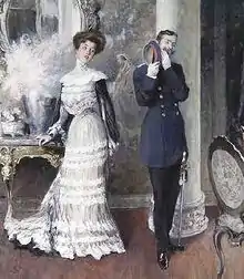A soldier hides his yawn from his lady companion in this detail from a painting by Oscar Bluhm titled Ermüdende Konversation, or "Wearisome conversation".