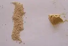 In winemaking, the term "wild yeast" has multiple meanings. In its most basic context, it refers to yeast that has not been introduced to the must by intentional inoculation of a cultured strain. Instead, these "wild yeasts" often come into contact with the must through their presence on harvest equipment, transport bins, the surface winemaking equipment and as part of the natural flora of a winery. Very often these are strains of Saccharomyces cerevisiae that have taken residence in these places over the years, sometimes being previously introduced by inoculation of prior vintages. In this context, these wild yeasts are often referred to as ambient, indigenous or natural yeast as opposed to inoculated, selected or cultured yeast. Wineries that often solely rely on these "in-house" strains will sometimes market their wines as being the product of wild or natural fermentations.[3] The (c. 304) Nanfang Caomu Zhuang has the earliest description of winemaking using "herb ferment" (cǎoqū 草麴) wild yeast with rice and various herbs, including the poisonous Gelsemium elegans (yěgé 冶葛).[12][13]