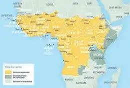 An estimated 90% of yellow fever infections occur on the African continent.[4] In 2016, a large outbreak originated in Angola and spread to neighboring countries before being contained by a massive vaccination campaign. In March and April 2016, 11 imported cases of the Angola genotype in unvaccinated Chinese nationals were reported in China, the first appearance of the disease in Asia in recorded history.[46][47]