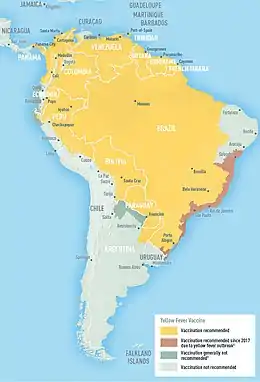 In March 2017, the WHO launched a vaccination campaign in Brazil with 3.5 million doses from an emergency stockpile.[42] In March 2017 the WHO recommended vaccination for travellers to certain parts of Brazil.[43] In March 2018, Brazil shifted its policy and announced it planned to vaccinate all 77.5 million currently unvaccinated citizens by April 2019.[44]