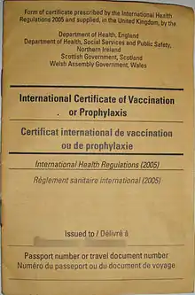 Some countries in Asia are considered to be potentially in danger of yellow fever epidemics, as both mosquitoes with the capability to transmit yellow fever as well as susceptible monkeys are present. The disease does not yet occur in Asia. To prevent introduction of the virus, some countries demand previous vaccination of foreign visitors who have passed through yellow fever areas. Vaccination has to be proved by a vaccination certificate, which is valid 10 days after the vaccination and lasts for 10 years. Although the WHO on 17 May 2013 advised that subsequent booster vaccinations are unnecessary, an older (than 10 years) certificate may not be acceptable at all border posts in all affected countries. A list of the countries that require yellow fever vaccination is published by the WHO.[45] If the vaccination cannot be given for some reason, dispensation may be possible. In this case, an exemption certificate issued by a WHO-approved vaccination center is required. Although 32 of 44 countries where yellow fever occurs endemically do have vaccination programmes, in many of these countries, less than 50% of their population is vaccinated.[4]